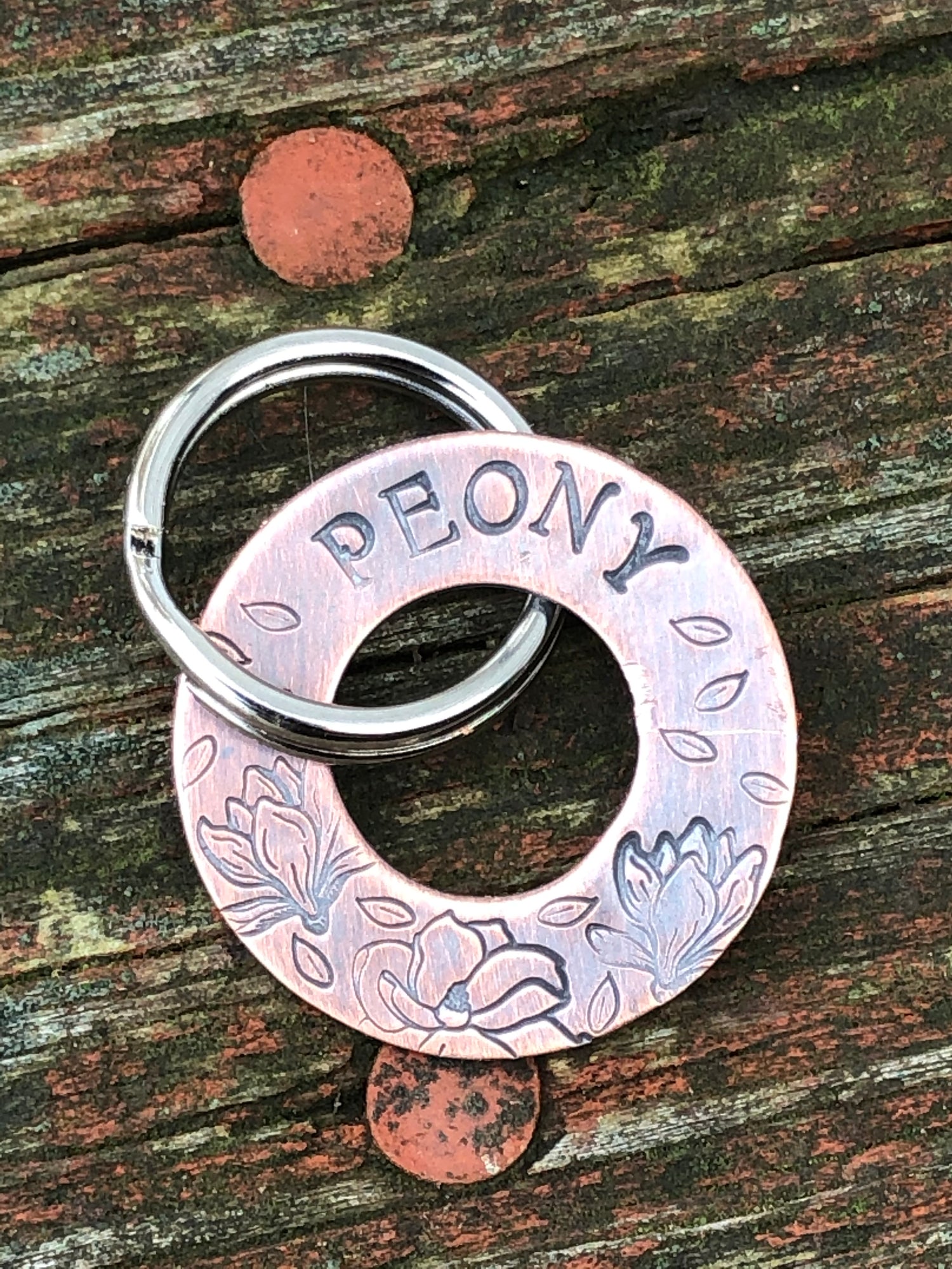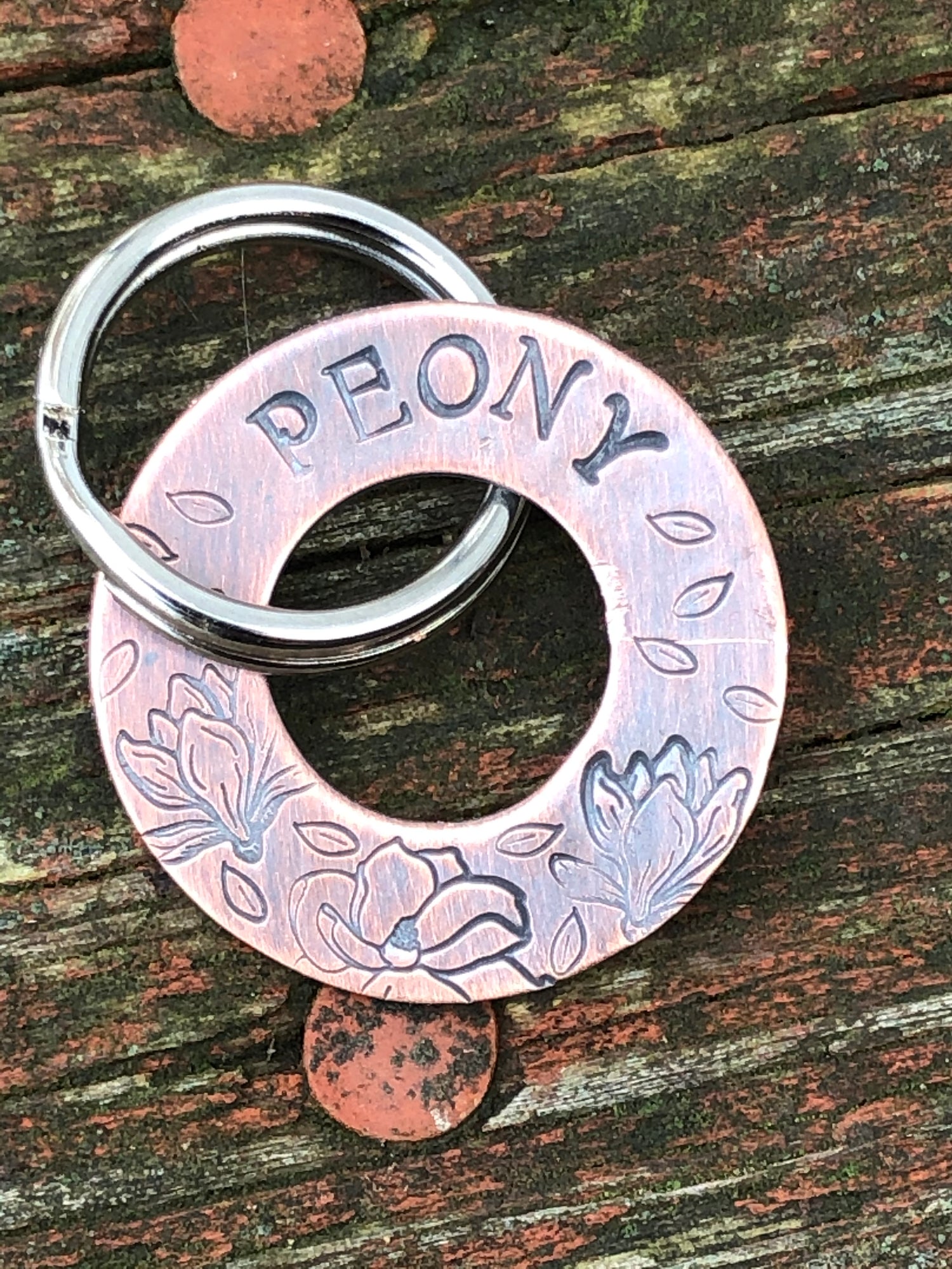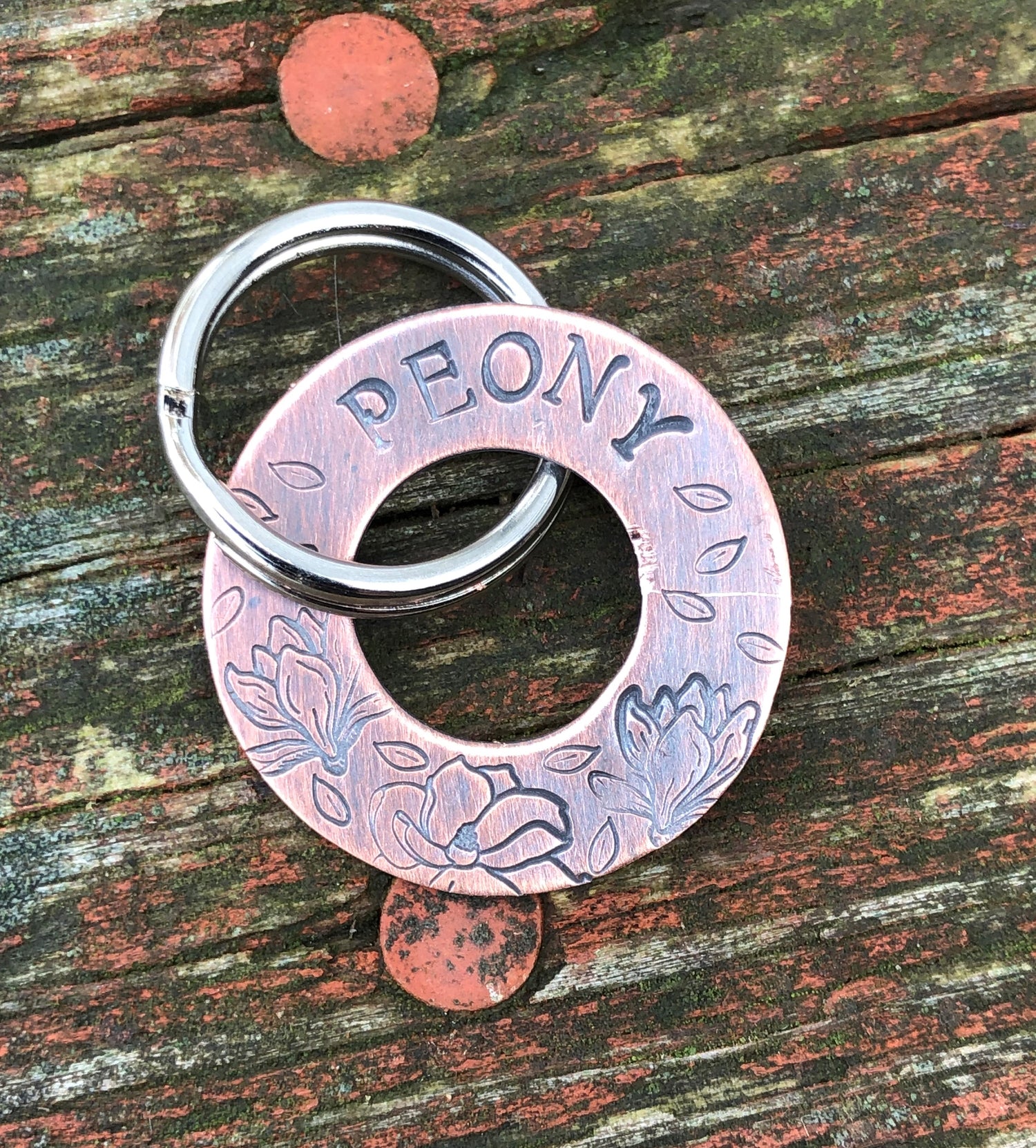 1" Washer is a lightweight, beautiful option for your pet. Stamped with a florals and a name on front, may will hold up to 25 characters. Comes in your choice of weathered copper, warm bronze and brushed aluminum. One large split ring is attached (we do it for you to prevent scratching tag :-)