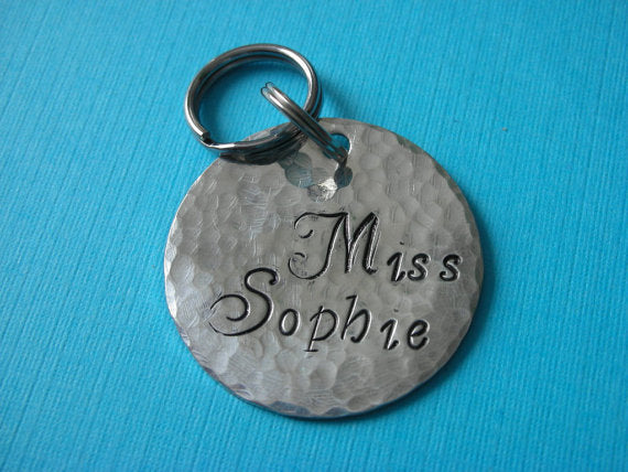 This is the ultimate gift for the dog who has everything. Beautiful hand hammered sterling silver disc simply holds your pampered pooch's name. Our beautiful stylish font along with monogram capital letters. Very classy.