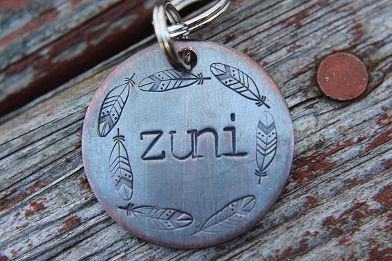 This 1.25" tag comes in your choice of copper (shown), bronze, nugold and brushed aluminum. Back holds up to two phone numbers or one number with short address(14 characters). Attached to 2 high quality stainless steel split rings to hang straight off of collar.